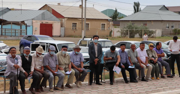كارانتين تالاپتارىنا ساي اۋىلدىق كلۋب الدىندا وتكەن كەزدەسۋگە اۋىل تۇرعىندارى, اقساقالدار, جاستار جينالدى.