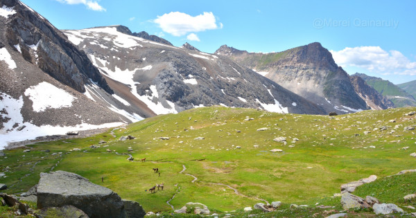...Аман-есен өттік мұздықтан. Кері осы жолмен қайтуды ойласақ, зәреміз зәр түбіне кетеді. Ол қорқынышты алдымыздағы жазиралы жайлау ұмыттырды. Жап-жасыл бет, жан-жағы тісті шыңдар.