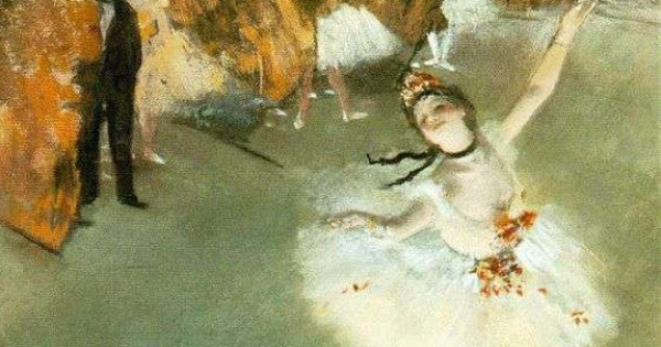 ءبيشى قىز بەيمالىم جاراتىلىس سەكىلدى كولەڭكەسى كورىنبەيدى. ساحنادا شىر اينالعان ەلەستەي... ينتەرەردىڭ اينالاسىنداعى بولشەكتەردى سىزباستان بۇرىن, سۋرەتشى ءبيشىنى جەردەگى شىندىقتان ءبولىپ العانداي. ارت جاعىنداعى بالەرينالار كۇزگى ورماندا اداسىپ جۇرگەندەي پەردە ىشىندە ب ۇلىڭعىرلاۋ بەينەلەنگەن.