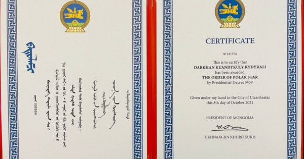 قازاقستانعا موڭعوليا دەلەگاتسياسىن باستاپ كەلگەن سىرتقى قاتىناستار ءمينيسترى ءباتمونحين باتتسەتسەگ قازاننىڭ 11-ءى كۇنى تۇركى اكادەمياسىندا بولىپ, حالىقارالىق ۇيىمنىڭ جۇمىستارىمەن تانىسقان ەدى. كەزدەسۋ بارىسىندا تامىرلاس ەلدەردىڭ ورتاق قۇندىلىقتارىن زەرتتەپ, حالىقتاردىڭ باۋىرلاستىعىن بەكەمدەۋدەگى اكادەميانىڭ ەڭبەگىن جوعارى باعالايتىنىن جەتكىزگەن ءباتمونحين باتتسەتسەگ دارحان قىدىرالىگە جوعارىدا اتالعان ماراپاتتى تاپسىردى.