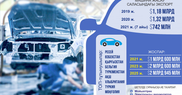 Машина жасау саласындағы негізгі үлес автокөлік құрастыру бағытына тиесілі. Былтыр отандық автоөндірушілер 75 мың автокөлік шығарған екен. Биыл 100 мыңдық межені бағындыру міндеті тұр. Сондай-ақ өткен жылы ішкі нарықта сатылған 96 мың автокөліктің 67 мыңы отандық өндірістен шыққан. Бұл Қазақстанда сатып алынатын әрбір үшінші көлік отандық өнім деген сөз. Экспорт көрсеткіштері де жақсарып келеді. Былтыр шетелге 8 мыңнан астам жеңіл көлік экспортталған. Биылғы меже – 15 мың автокөлік. Келер жылы 30 мың автокөлікті шетелге жөнелту жағы қарастырылуда.