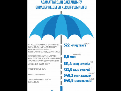 جىل سايىن ازاماتتاردىڭ ساقتاندىرۋ ونىمدەرىنە دەگەن قىزىعۋشىلىعى ارتىپ كەلە جاتىر. 2021 جىلدىڭ 1 قازانىنداعى جاعداي بويىنشا ساقتاندىرۋ (قايتا ساقتاندىرۋ) كەلىسىمشارتتارى بويىنشا قابىلدانعان سىيلىقاقىلار كولەمى 522 ملرد تەڭگەگە جەتكەن: ءسويتىپ, ءبىر جىل ىشىندە بىردەن 40 پايىزعا كوبەيىپ شىعا كەلگەن. سونىمەن بىرگە, جەكە جانە زاڭدى تۇلعالاردىكىن قوسا ەسەپتەگەندە جىل باسىنان بەرى جاسالعان ساقتاندىرۋ كەلىسىمدەرى 8,6 ملن-عا جەتكەن. بۇل دا 2020 جىلداعى كورسەتكىشتەن 34,4 پايىزعا كوپ. سونىڭ ىشىندە ءاۆتوموبيلدى ساقتاندىرۋ – 14 پايىزعا (511,4 مىڭ كەلىسىم), ءتۋريستى ساقتاندىرۋ – 4,2 ەسە (313,5 مىڭ), ءومىردى ساقتاندىرۋ – 50,3 پايىز (548,3 مىڭ), جازاتايىم وقيعالاردان ساقتاندىرۋ 2,2 ەسە (640,8 مىڭ) ارتقان.