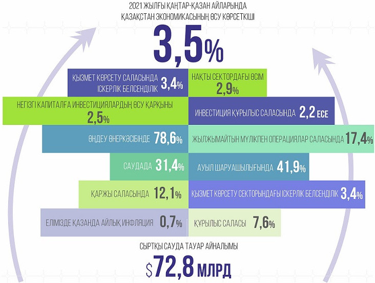 ۇلتتىق ەكونوميكا ءمينيسترى ءا.ەرعاليەۆتىڭ ايتۋىنشا, بيىلعى قاڭتار-قازان ايلارىندا قازاقستان ەكونوميكاسىنىڭ ءوسۋ كورسەتكىشى 3,5%-دى قۇرادى. وسى ەسەپتى كەزەڭدە نەگىزگى ترەندتەر بويىنشا قىزمەت كورسەتۋ سەكتورىنداعى ءوسۋ قارقىنىنىڭ جەدەلدەۋى, وڭدەۋ ونەركاسىبى مەن قۇرىلىس سالالارىنىڭ ەكونوميكانىڭ ءوسۋى مەن تۇراقتىلىعىنىڭ درايۆەرلەرى بولىپ قالا بەرۋى, ەكسپورتتىڭ جوعارى ءوسىم ديناميكاسى, ءوندىرۋشى ەمەس سەكتورلارداعى جوعارى ينۆەستيتسيالىق بەلسەندىلىكتىڭ ساقتالۋى بايقالۋدا. «وسى جىلدىڭ قاڭتار-قازانىندا ناقتى سەكتورداعى ءوسىم 2,9% قۇرادى. قىزمەت كورسەتۋ سالاسىندا ىسكەرلىك بەلسەندىلىك 3,4%-عا دەيىن ءوستى. سالالار اراسىندا اقپارات جانە بايلانىس, ساۋدا, سۋمەن جابدىقتاۋ, قۇرىلىس, ەلەكترمەن جابدىقتاۋ, وڭدەۋ ونەركاسىبى جوعارى ءوسىم كورسەتۋدە», دەدى ءا.ەرعاليەۆ.