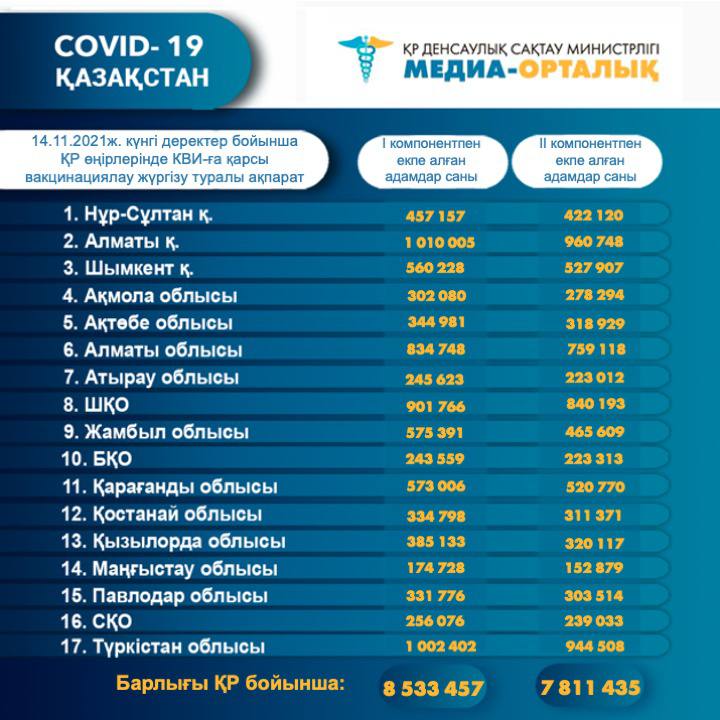 2021 جىلعى 14 قاراشاداعى مالىمەت بويىنشا قازاقستاندا كوروناۆيرۋسكە قارسى ۆاكتسينانىڭ I كومپونەنتىن 8 533 457 ادام, II كومپونەنتىن 7 811 435 ادام سالدىردى, دەپ حابارلايدى Egemen.kz قر دسم ءباسپاسوز قىزمەتىنە سىلتەمە جاساپ.