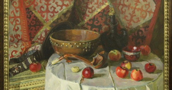 سۋرەتشى نازارىن جارىققا, كونتراسقا جانە ساندىك دەتالدارعا اۋدارىپ, وسىلاردىڭ كومەگىمەن ناتيۋرمورت زاتتارىن جابدىقتايدى. ەكىنشى پلانداعى كىلەمنىڭ ساندىك فونى تاپ-تازا اق داستارقانعا قاراما-قارسى بولىپ تۇر. ۇلكەن زەرەن شاشىلىپ جاتقان المالارمەن قاتار ورنالاسقان. جارىق ءتۇسىپ تۇرعان داستارقاننىڭ كولەڭكە جاعىنا تورسىقتى جاسىرعان. جيرەن, قىزىل تۇستەردىڭ باسىمدىعى تۇرمىستىق زاتتاردىڭ جىلىلىعىن اسپەتتەيدى.
