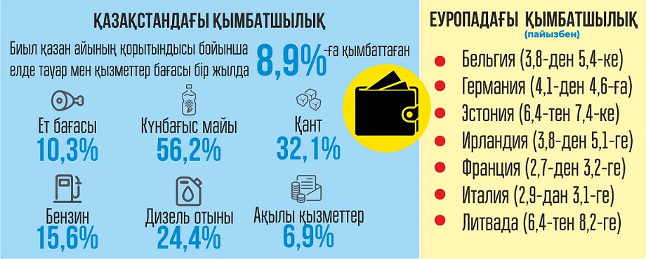 وسىممەن قاتار ينفلياتسيا دا جوعارىلاپ كەلە جاتىر. بيىل قازان ايىنىڭ قورىتىندىسى بويىنشا ەلدە تاۋار مەن قىزمەتتەر باعاسى ءبىر جىلدا 8,9 پايىزعا قىمباتتاعان. ينفلياتسيانىڭ ايتارلىقتاي ءوسىمى بيىل ماۋسىم ايىنان بەرى قاتتى بايقالعان. قىمباتشىلىق ازىق-ت ۇلىك ونىمدەرىنە, باسقا دا تاۋارلارعا جانە اقىلى قىزمەتتەردى شارپىپ تۇر.