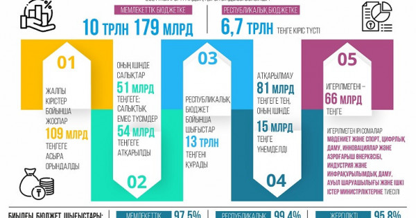 – جەرگىلىكتى بيۋدجەتتەردىڭ كىرىستەرى 107,5%-عا اتقارىلىپ, 3,5 ترلن تەڭگەنى قۇرادى. جوسپار 243 ملرد تەڭگەگە, ونىڭ ىشىندە سالىق بويىنشا 202 ملرد تەڭگەگە اسىرا ورىندالدى. مەملەكەتتىك بيۋدجەتتىڭ شىعىستارى 97,5%-عا, رەسپۋبليكالىق بيۋدجەتتىڭ شىعىستارى 99,4%-عا, جەرگىلىكتى بيۋدجەتتەردىڭ شىعىستارى 95,8%-عا اتقارىلدى. رەسپۋبليكالىق بيۋدجەت بويىنشا شىعىستار 13 ترلن تەڭگەنى قۇرادى. اتقارىلماۋ 81 ملرد تەڭگەگە تەڭ, ونىڭ ىشىندە 15 ملرد تەڭگە ۇنەمدەلدى. يگەرىلمەگەنى – 66 ملرد تەڭگە. يگەرىلمەگەن ءىرى سومالار مادەنيەت جانە سپورت, تسيفرلىق دامۋ, يننوۆاتسيالار جانە اەروعارىش ونەركاسىبى, يندۋستريا جانە ينفراقۇرىلىمدىق دامۋ, اۋىل شارۋاشىلىعى جانە ىشكi iستەر مينيسترلىكتەرىنە تيەسىلى. بۇعان نەگىزىنەن قاتارىندا ناقتى كورسەتىلگەن قىزمەتتەر كولەمى ءۇشىن اقى تولەۋ, ورىندالعان جۇمىستار اكتىلەرىن, شوت-فاكتۋرالاردى ۋاقتىلى ۇسىنباۋ, كونكۋرستىق راسىمدەردى ۇزاق وتكىزۋ, قارجىلاندىرۋ جوسپارلارىنا وزگەرىستەر ەنگىزۋ سەبەپ بولعان, – دەدى ول.
