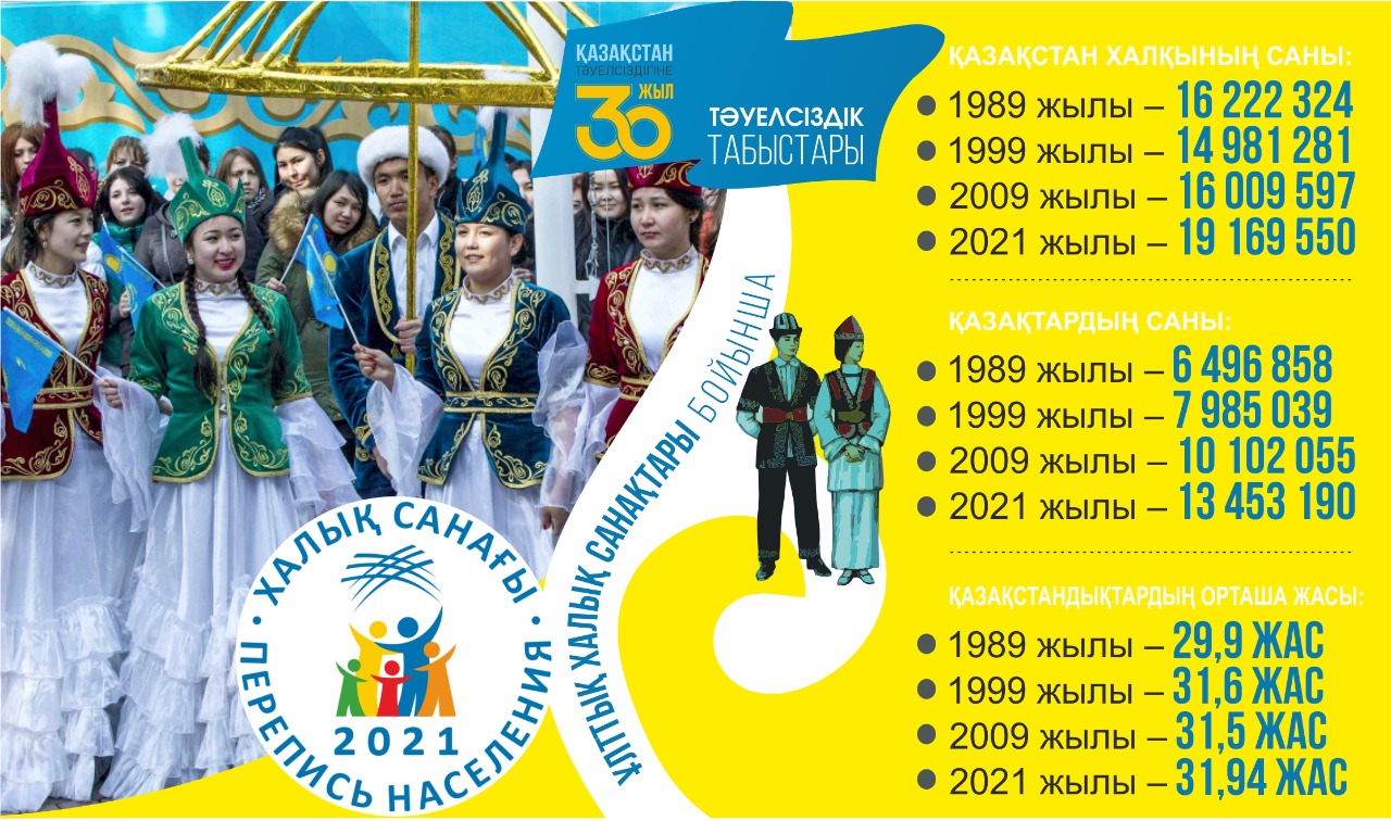 ەل پرەزيدەنتى قاسىم-جومارت توقاەۆقا بيىلعى 1 قىركۇيەك پەن 30 قازان ارالىعىندا جۇرگىزىلگەن ۇلتتىق حالىق ساناعىنىڭ العاشقى ناتيجەلەرى تۋرالى بايانداعان پرەمەر-مينيستر اسقار ءماميننىڭ مالىمەتىنە سۇيەنسەك, قازاقستاندىقتاردىڭ جالپى سانى 19 169 550 ادامعا تەڭ. وتانداستارىمىزدىڭ 48,71 پايىزى – ەرلەر, 51,29 پايىزى – ايەلدەر. قازاقستاننىڭ تاۋەلسىز ەل رەتىندە العاش رەت وتكىزگەن ۇلتتىق ساناعىنان بەرى, ياعني 1999 جىلدان بەرى قاراي حالىقتىڭ سانى 4,1 ملن ادامعا كوبەيگەن. بۇل – ۇلكەن جەتىستىك!