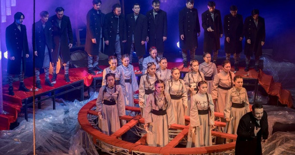 ودان بولەك سپەكتاكلدىڭ دەكوراتسياسى مەن كوستيۋمدەرى دە كوڭىلگە ەرەكشە قونىمدى, قويىلىم اتموسفەراسىن جەتكىزۋدە ۇتىمدى قىزمەت اتقارىپ تۇر. شىمىلدىقتى اينالا قورشاعان قىپ-قىزىل تۇسكە بويالعان اسپالى كوپىرلەر مەن ساحنا ورتاسىنداعى الىپ قىزىل شاڭىراق, جوعارىدان تومەن قاراي ەنتەلەگەن اسپالى شامعا ۇقسايتىن باعانالار – مۇنىڭ بارلىعى سپەكتاكل باستالماي تۇرىپ-اق وقيعانىڭ تۇرمىستان الدەقايدا الشاق, كۇللى ادامزاتتىق دەڭگەيدەگى پروبلەمالاردى قاۋزايتىن, كوتەرەر كوركەمدىك قۋاتى الدەقايدا سالماقتى دۇنيە ەكەندىگىن بىردەن اڭعارتاتىنداي. ءتىپتى نەگىزگى باسىمدىققا يە قىزىل ءتۇس – قويىلىمنىڭ تراگەديالىق كۇيىنىڭ حابارشىسىنداي.