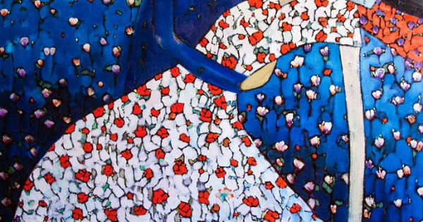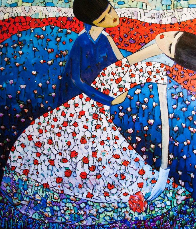 گۇلزار باق ىشىندە بۇرالا بيلەگەن قوس عاشىقتىڭ اينالاسى تولعان راۋشان گ ۇلى. اق پەن قىزىل تۇستەردىڭ ءوزارا بايلانىسى, كوك تۇسپەن شەكارالاسىپ شىعارمانىڭ ينتەرەرىن بايىتىپ تۇر. بۇل بوياۋلار جاستىق شاقتىڭ اساۋلىعىن, تازالىعىن سيپاتتايدى. بوزبالا مەن بويجەتكەننىڭ ءمولت ەتكەن ماحابباتىنان جارالعان كومپوزيتسيا كوڭىل ەلىتىپ قانا قويماي, جۇرەككە جىلۋ ۇيالاتادى.