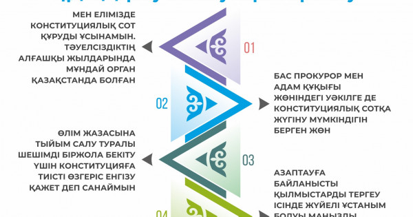 پرەزيدەنت ۇسىنىپ وتىرعان رەفورمالاردىڭ نەگىزگى وزەگى – شىنايى قۇقىقتىق, دەموكراتيالىق مەملەكەت قۇرۋ جولىندا قوردالانعان ماسەلەلەردىڭ شەشىمىن تابۋ. بۇگىندە مەملەكەت باسشىسى وسىعان دەيىن ۋادە ەتكەن ساياسي جانە قۇقىقتىق رەفورمالاردىڭ كەزەڭ-كەزەڭىمەن جۇزەگە اسىرىلىپ جاتقانىنا كۋا بولىپ وتىرمىز. اتا زاڭ ەرەجەلەرىنىڭ مۇلتىكسىز ساقتالۋىن قامتاماسىز ەتەتىن كونستيتۋتسيالىق سوت قۇرۋ تۋرالى ۇسىنىس وسى باعىتتا جاسالعان ماڭىزدى قادام بولماق.