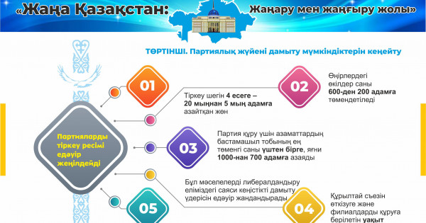 ۇلتتىق قۇرىلتايدىڭ قۇرىلاتىنى, جەرگىلىكتى ءوزىن ءوزى باسقارۋدى كۇشەيتۋ مەن اكىمدەردى تاڭداۋ, جاڭا پارتيالارعا جول اشۋ, ادام قۇقىقتارىنىڭ قورعالۋىن جەتىلدىرۋ سەكىلدى ناقتى قادامدار ىسكە اسپاق. قاسىم-جومارت كەمەل ۇلى سۋپەرپرەزيدەنتتىك جۇيەنىڭ ەسكىرگەنىن العا تارتا وتىرىپ ءوزىنىڭ پارتياعا مۇشە بولمايتىنىن مالىمدەدى جانە قۇزىرەتتەرىنىڭ ءبىرتالايىن پارلامەنتكە بەرىپ, ونىڭ الەۋەتىن كۇشەيتپەك. سونىمەن قاتار پرەزيدەنتتىڭ تۋىستارىنا مەملەكەتتىك بيلىكتە نەمەسە ۇلتتىق كومپانيالاردا, كۆازيمەملەكەتتىك سەكتوردا قىزمەت ىستەۋگە تىيىم سالاتىن جاڭا زاڭ قابىلداناتىنى دا قۇپتارلىق ءىس. بۇدان بىلاي پرەزيدەنت تۋىستارىنىڭ مەملەكەتتىك قىزمەت پەن ۇلتتىق كومپانيالاردا جۇمىس ىستەۋىنە تىيىم سالىنادى.