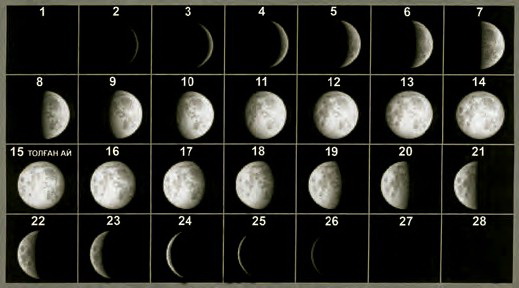 حالىق اراسىندا «ايدىڭ ون بەسى جارىق, ون بەسى قاراڭعى» دەگەن قاعيدات بار. ياعني جاڭا تۋعان ايدىڭ وراعىنىڭ ۇلعايۋىن – ايدىڭ جاڭاسى دەپ اتاپ, ارى قاراي جارتى (سۋرەتتە 8) شەڭبەر قۇرعانعا دەيىن, «ايدىڭ ءبىر جاڭاسى, ەكى جاڭاسى, ءۇش جاڭاسى... جەتى جاڭاسى» دەپ ساناپ, ودان كەيىنگى اي تولعانعا دەيىنگى ءبىر اپتا, جەتى كۇندى «ايدىڭ سەگىزى, توعىزى... ون ءتورتى» دەپ ەسەپتەيدى. ال ون بەسى كۇنى اي تولادى. حالىق جىرلارىندا «تولعان ايداي تولىقسىپ» دەيتىنى وسى.