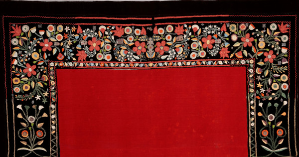 مۋزەي جادىگەرلەرىنىڭ ىشىندە حح عاسىردىڭ باسىندا سەمەي ءوڭىرىنىڭ تۇرعىنى ماريام يلاكوۆا تىككەن تۇسكيىز ەرىكسىز نازار اۋدارتادى. قۇندى جادىگەر تابيعي مارجان تاستارمەن ورنەكتەلگەن. جىپتەي ەسىلگەن تەمىرمەن ءورىلىپ, اسەمدەلگەن بۇل بۇيىمنىڭ كوز تارتاتىن تاعى ءبىر قۇپياسى, تۇسكيىزدى ماريام يلاكوۆا ءوز ساۋكەلەسىنەن توقىعان. انادان قىزىنا مۇرا رەتىندە بەرىلەتىن ساۋكەلەنى يەسى قانداي دا ءبىر سەبەپتەرمەن وتپەلى كەزەڭدەردە ساقتاپ قالۋ ءۇشىن, سوگىپ, ونداعى بۇيىمداردى تۇسكيىز بەتىنە باسقان. ناتاليا باجەنوۆا تۇسكيىزدى ء«تۇرلى-ءتۇستى گۇلدەردى تەرىپ كەلىپ, ماتا ۇستىنە قوندىرا سالعانداي اسەر بەرەدى. قارا, قىزىل بارقىتتىڭ ۇيلەسىمى اشىق ءتۇستى مارجاندارمەن ۇيلەسىم تاۋىپ, قولدان تىگىلگەن گۇلدەر سيممەتريا زاڭىن ساقتاي وتىرىپ سالتانات قۇرىپ تۇر», دەپ سيپاتتايدى. راسىندا دا شام جارىعىمەن شاعىلىسقان تابيعي مارجان تاستار تۇسكيىز بەتىندە ءتۇرلى-ءتۇستى رەڭكتە گۇلدى ورنەكتەر سالىپ جارقىراي, مامىر ايىنىڭ لەبىندەي, جىپ-جىلى كوڭىل كۇي سىيلايدى.