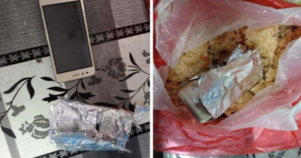 تەكسەرۋ بارىسىندا ءبىر رەتتىك ىدىسقا سالىنعان ىستىق پالاۋ ىشىنەن فولگا قاعازىنا ورالعان ءبىر ۇيالى تەلەفون مەن ءبىر SIM-كارتا تابىلدى.
