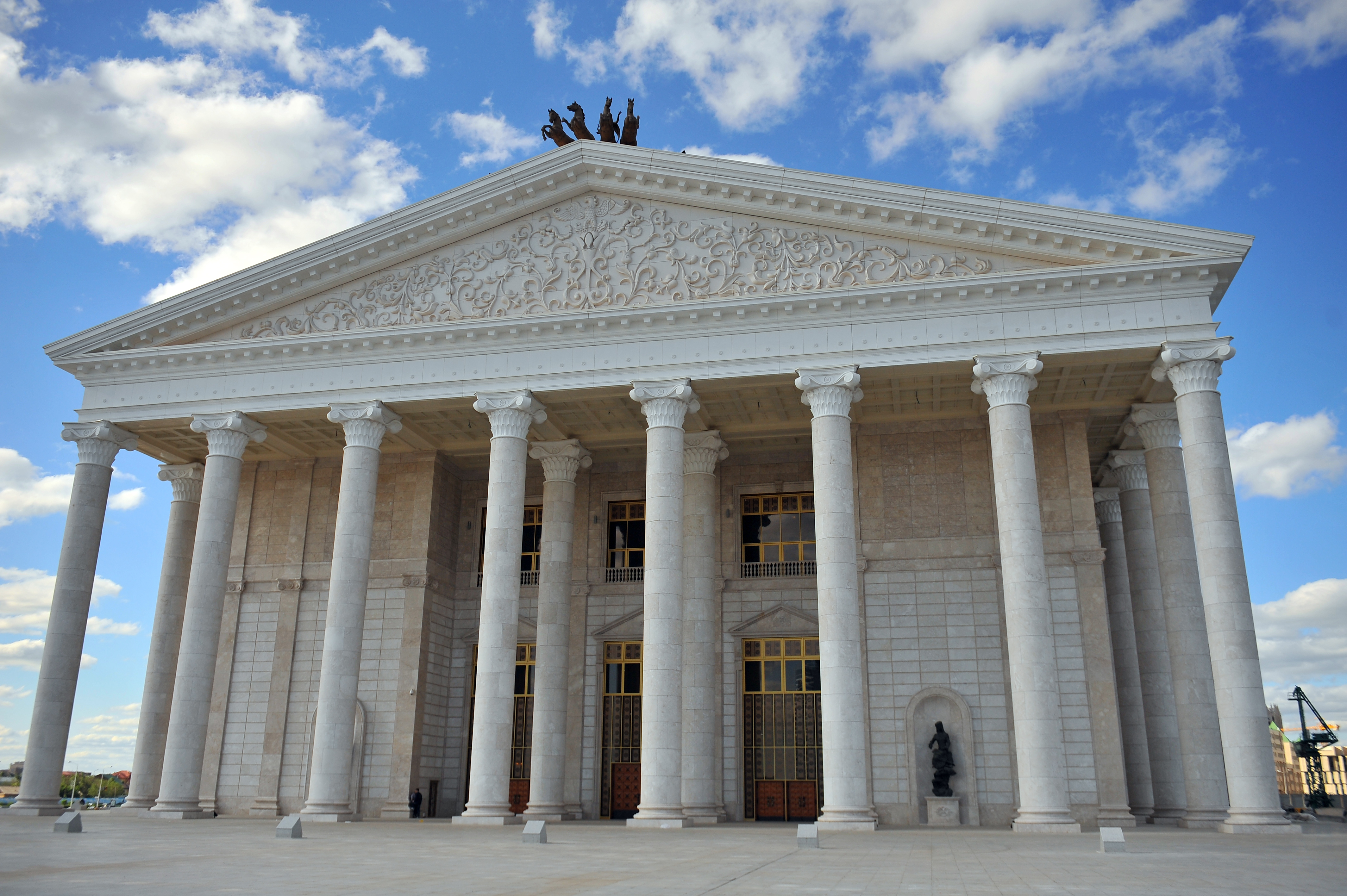 ەڭسەلى ەلوردامىزدىڭ كەلبەتىن ودان ءارى كورىكتەندىرگەن تاعى ءبىر اسەم مەكەن – ق.قۋانىشباەۆ اتىنداعى اكادەميالىق قازاق مۋزىكالىق دراما تەاترىنىڭ جاقىندا بوي كوتەرگەن سۋ جاڭا عيماراتى. باس شاھار تورىندە قازاق دراما تەاترى عيماراتىنىڭ سالىنۋى – ايتۋلى وقيعا, اسقاق ارمان, تاريحي ءسات. 1991 جىلدىڭ قاراشاسىندا رەجيسسەر, قازاقستاننىڭ ەڭبەك سىڭىرگەن قايراتكەرى جاقىپ وماروۆتىڭ تىكەلەي باستاماسىمەن تاقىر جەردەن تۋ كوتەرگەن تاعىلىمدى وردا بۇگىندە ەلدىگىمىزبەن ەگىز جاساسىپ, جاسامپازدىقتىڭ جارقىن رۋحىمەن جۇرەكتەردى جىگەرلەندىرىپ, كوڭىلدەردى كەمەلدەندىرىپ, كورەرمەنىن ءاماندا تەك رۋحاني بايىتىپ كەلە جاتىر.