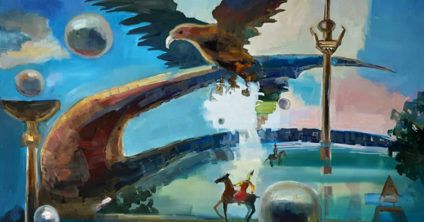 ماسەلەن, سۋرەتكەردىڭ ءبىز ۇسىنعان كارتيناسىنا نازار سالىڭىزشى. قىران قۇس, قىش ىدىستار, اتتى ادام, شام, دومالانعان دۇنيە ءبارى-ءبارى الىستان مۇنارتادى, ولار ءار ءداۋىردىڭ بەلگىلەرى, بىراق كەنەپكە كەنەتتەن قونباعان. اۆتوردىڭ ويلاۋ ءورىسى اسپاندى تۇتاستاي ءبىر جارىقتىڭ شەڭبەرىنە بايلاپ, وتكەن مەن بۇگىنگىنىڭ اراسىنا شەكارا قويمايدى. شىعارمانىڭ ەرەكشەلىگى دە وسىندا.