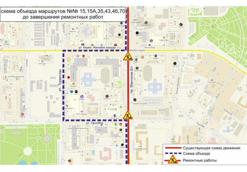 «ماڭگىلىك ەل داڭعىلى بويىمەن كەرەي جانىبەك حاندار كوشەسىنەن ورىنبور كوشەسىنە دەيىنگى ارالىقتا جول جوندەۋ جۇمىستارى جۇرگىزىلۋىنە بايلانىستى № 15, 15ا, 35, 43, 46, 54, 70 باعدارلارىنىڭ قوزعالىس سىزباسىنا ۋاقىتشا وزگەرتۋلەر ەنگىزىلدى. ءوز باعدارلارىڭىزدى الدىن-الا جوسپارلاۋلارىڭىزدى سۇرايمىز», دەپ مالىمدەدى «City Transportation Systems» جشس.