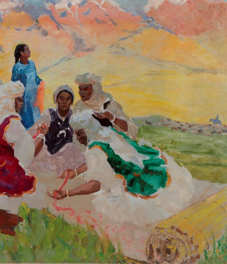 ءبىر قاراعاندا, بۇل كارتينا قاراپايىم. باسى ارتىق ەشنارسە جوق. دالاداعى كوك مايسا ۇستىندە اق جاۋلىق كيگەن اجەلەر كيىز باسىپ جاتىر. ال بىراق ونىڭ استارىنا ۇڭىلسەڭىز, قىلقالام شەبەرى وسى جۇمىسى ارقىلى حالقىمىزدىڭ سان عاسىردان بەرى اتادان بالاعا جالعاسىپ كەلە, ادەت-عۇرپىن, سالت-ءداستۇرىن, قول ونەرىن, قىسقاسى, عاجايىپ ۇلتتىق ەتنوگرافيامىزدى كوركەم بەينەلەگەن. بۇل جەردە كيىز باسىپ جاتقان اجەلەر عانا ەمەس, بايتاق دالامىزدىڭ تۇمسا تابيعاتى مەن اسقاق تاۋى جاراسىمدىلىعىمەن كوز تارتادى.