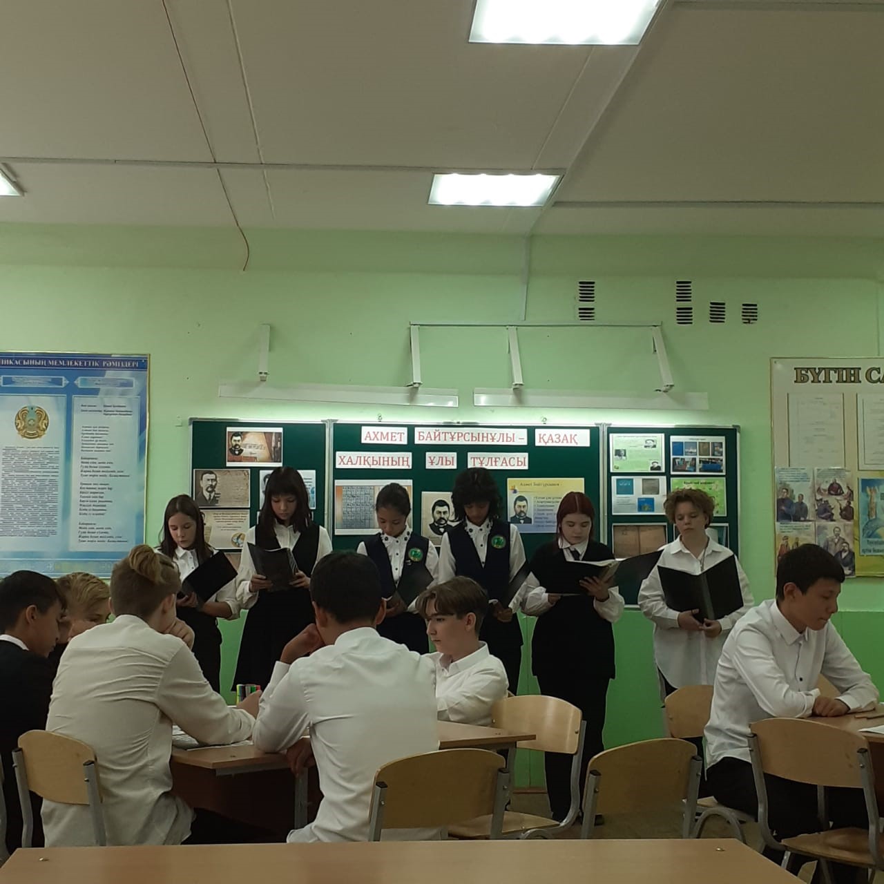 ەڭ ۇلكەن شارا مەكتەپتىڭ اكت زالىندا بولىپ, مۇندا مۇعالىمدەر مەن وقۋشىلار كەلگەن قوناقتارعا وزدەرىنىڭ ونەرلەرىن كورسەتىپ باقتى.