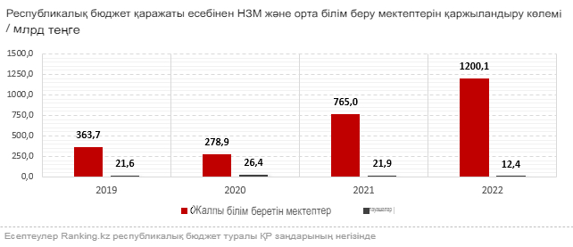 ەلىمىزدە 7550 قالالىق جانە ايماقتىق مەكتەپ بار. ولارعا ورتاشا ەسەپپەن بيۋدجەتتەن 159 ميلليون تەڭگە بولىنەدى (1 مەكتەپكە).