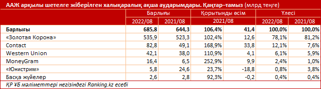 سونداي-اق ايتارلىقتاي اۋدارىم كولەمى Contact (82,8 ملرد تەڭگە) جانە Western Union (42,1 ملرد تەڭگە) كومپانيالارىنا دا تيەسىلى.