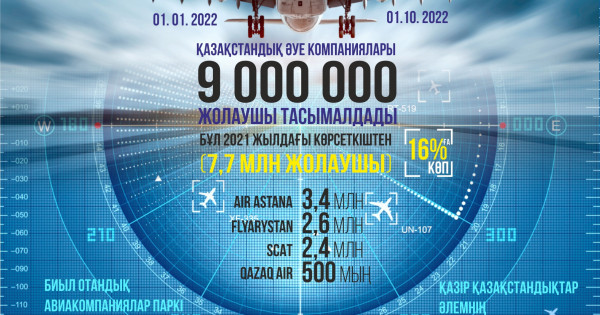 Биыл аталған саладағы жетістіктер жолаушылар тасымалының ұлғаюынан байқалады. Жыл басынан бергі 10 айда қазақстандық әуе компаниялары шамамен 9 млн адамды тасымалдады. Бұл 2021 жылдағы көрсеткіштен 16%-ға (7,7 млн жолаушы) көп. Мысалы, Air Astana компаниясында жолаушылар ағыны шамамен – 3,4 млн адамға, FlyArystan компаниясында – 2,6 млн адамға жуықтап, SCAT компаниясында жолаушылар саны – 2,4 млн-ға және Qazaq Air-да 500 мың адамға өскен.