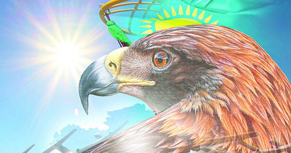 توسبەلگىنىڭ ورتاسىندا قازاقستان رەسپۋبليكاسىنىڭ قازىرگى جەر اۋماعىن بەينەلەيتىن كارتا كورىنىس تاپقان. سونىمەن قاتار قازاقستان اۋماعىن ءبىزدىڭ جىل ساناۋىمىزعا دەيىن 5-4 عاسىرلاردا مەكەن ەتكەن ساقتاردىڭ ەسىك قورعانىنان تابىلعان التىن ادامى بەينەلەنگەن. بۇل قازاق تاريحىنىڭ ساقتار زامانىمەن بايلانىستى ەكەنىن بىلدىرەدى. بۇدان كەيىن بەلگىدە عۇندار مەملەكەتىنىڭ نەگىزىن قالاعان مودە قاعان جانە عۇن مەملەكەتتىلىگىنىڭ شاڭىراعى كوتەرىلگەن ب.ز.د 209 جىل كورىنىس تاپقان.