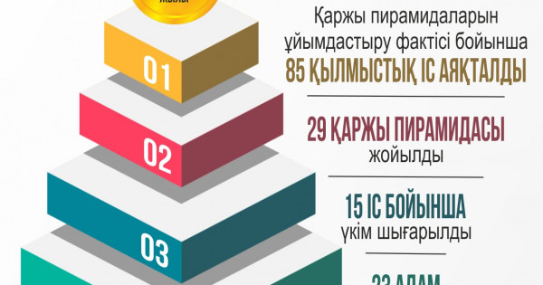 2019 جىلى قارجى پيراميداسىن جاساۋشىلارعا قاتىستى قىلمىستىق ءىس سانى سالىستىرمالى تۇردە از بولدى, ال پاندەميانىڭ ءبىرىنشى جىلىندا ول بىردەن جەتى ەسە, ياعني 24-تەن 180-گە دەيىن وسكەن. كەلگەن شىعىن مولشەرى 2020 جىلى 1,59 ملرد تەڭگەدەن 6,17 ملرد تەڭگەگە دەيىن ارتقان. 2021 جىل قازاقستاندا قارجى پيراميداسىن قۇرۋشىلار ءۇشىن ناعىز گۇلدەنگەن كەزەڭ بولعانعا ۇقسايدى.
