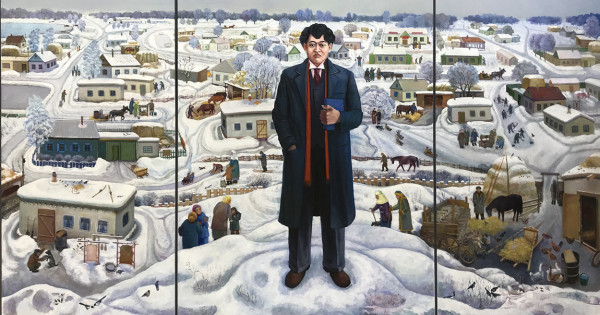 بەلگىلى سۋرەتشى سەرىكباي ءالجانوۆ الاش قوزعالىسىنىڭ بەلدى قايراتكەرى, اقىن, قازاق ادەبيەتىنىڭ جارقىن جۇلدىزى ماعجان جۇماباي ۇلى وبرازىن اۋقىمدى تريپتيحتا ورىنداعان. قىسقى مەزگىلدەگى قازاق اۋىلى ماڭايىنداعى توبەدە, شوقتىعى بيىك ۇلى ماعجاندى قولىنا كىتاپ ۇستاتىپ, ۇلكەيتىپ بەينەلەگەن. دارقان دالانىڭ توپىراعىنان تۋعان قازاق بالاسى وسى تۋىندىدا بايتاق ەلدىڭ جاناشىرى رەتىندە سۋرەتتەلەدى. مۇندا تىكە قاراعان ماعجان بەينە ءبىر, ەلىنىڭ بولاشاعىن بۇگىنگى ۇرپاعىنا ۇمىتپەن امانات قىلىپ تاپسىرىپ تۇرعانداي.