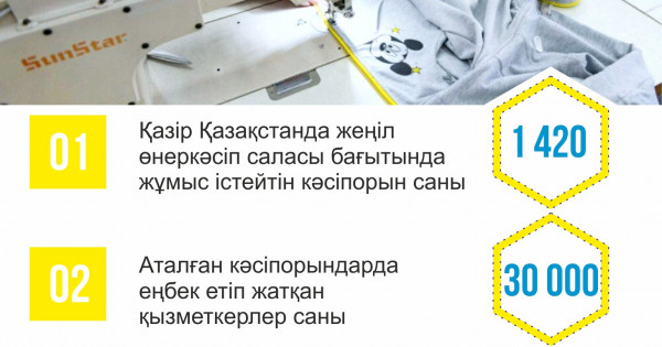«انىقتالعان تابىستى باعىتتار مەملەكەتتىك شىعىندى ازايتىپ, بىراق سالا وندىرىسىنە ايتارلىقتاي اسەر ەتەتىن كيىم ءوندىرىسى سەگمەنتتەرىن دامىتۋدىڭ مۇمكىندىگىن كورسەتىپ وتىر. وسىعان وراي شەتەلدە وتاندىق مامانداردى وقىتۋعا سۋبسيديا بەرۋ جانە وتاندىق برەندتەردىڭ مەملەكەتتىك دەڭگەيدە اقپاراتتىق سۇيەمەلدەۋىن قامتاماسىز ەتۋ ماسەلەسىن پىسىقتاۋ قاجەت. قازىر قازاقستاندا جەڭىل ونەركاسىپ سالاسى باعىتىندا جۇمىس ىستەيتىن 1 420 كاسىپورىن تىركەلىپ, شامامەن 30 مىڭ ادام ەڭبەك ەتەدى», دەدى يندۋستريا جانە ينفراقۇرىلىمدىق دامۋ مينيسترلىگى جەڭىل ونەركاسىپ باسقارماسىنىڭ باسشىسى ايجان ءادىلوۆا.