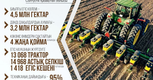 ەگىس ناۋقانىن ناتيجەلى وتكىزۋ تەحنيكالىق جابدىقتارمەن, ماشينا-تراكتور پاركىن جوندەۋ جانە جاڭالاۋ, ونى دايىنداۋمەن تىكەلەي بايلانىستى ەكەنى دە ءمالىم. بيىلعى ەگىس ناۋقانىن جۇرگىزۋگە ءتۇرلى ۇلگىدەگى 13 068 تراكتور (ونىڭ ىشىندە 4 مىڭنان استام ونىمدىلىگى جوعارى ماشينا), 14 968 استىق سەپكىش, 1 418 زاماناۋي ونىمدىلىگى جوعارى ەگىس كەشەنى قاتىسادى دەپ جوسپارلانۋدا. بۇگىنگى تاڭداعى تەحنيكانىڭ دايىندىعى 95 پايىزدى قۇرايدى.