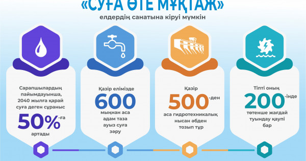 مەملەكەت باسشىسى قاسىم-جومارت توقاەۆتىڭ ەلىمىزدىڭ الەۋمەتتىك-ەكونوميكالىق دامۋ ماسەلەلەرى جونىندەگى كەڭەيتىلگەن كەڭەستە, ەلدىڭ دامۋىنا قاتىستى ءبىراز ماسەلەنى قامتىپ, ماڭىزدى باعىتتاردى تاعى ءبىر ناقتىلادى. ونىڭ ىشىندە سۋ ماسەلەسى ايىرىقشا ايتىلدى. «سۋدى ۇنەمدەپ تۇتىنۋىمىز كەرەك. مەن سۋ تاپشىلىعىنىڭ ارتىپ جاتقانىن ۇدايى ايتىپ ءجۇرمىن. ساراپشىلاردىڭ پايىمداۋىنشا, 2040 جىلعا قاراي سۋعا دەگەن سۇرانىس 50 پايىزعا ارتادى. قازاقستان 2050 جىلعا قاراي «سۋعا وتە مۇقتاج» ەلدەردىڭ ساناتىنا كىرۋى مۇمكىن», دەدى پرەزيدەنت.