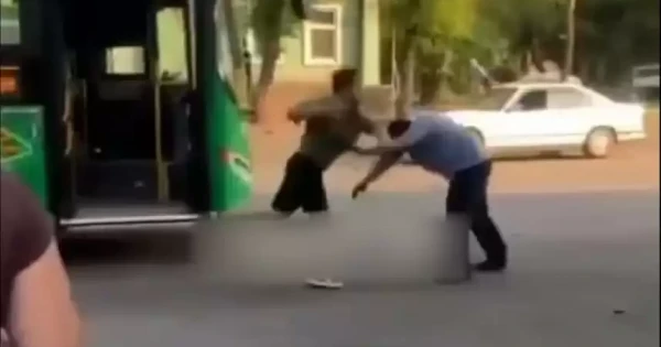 بەينەجازبادان جاس جىگىتتىڭ اۆتوبۋس جۇرگىزۋشىسىنە قاراي جۇدىرىق الا جۇگىرگەنىن جانە تەپكەنىن كورۋگە بولادى.