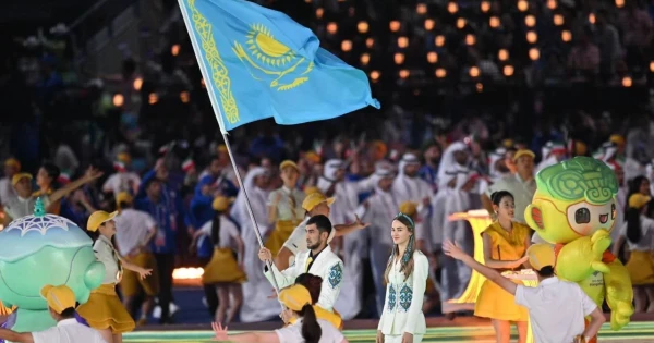 ەلىمىزدىڭ دەلەگاتسياسىن باستاپ, كوك بايراعىمىزدى كوتەرىپ بوكسشى اسلانبەك شىمبەرگەنوۆ جانە جەڭىل اتلەت نادەجدا دۋبوۆيتسكايا شىقتى. ء«بىزدىڭ كوماندانىڭ الدىندا جانكۇيەرلەردىڭ ءۇمىتىن اقتاۋ جۇكتەلدى, سپورتشىلارىمىز بۇعان دەيىنگى وتكەن ازيا ويىندارىنداعى ناتيجەدەن دە جوعارى كورسەتكىشكە جەتۋ مىندەتى تۇر», دەپ مالىمدەدى تۋريزم جانە سپورت ءمينيسترى ەرمەك مارجىقپاەۆ.
