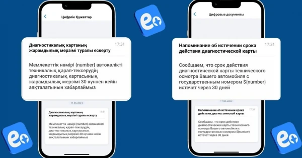 اتالعان جاڭاشىلدىق ازاماتتارعا قۇجاتتىڭ جارامدىلىق مەرزىمى تۋرالى 30 كۇن بۇرىن ەسكەرتۋگە مۇمكىندىك بەرەدى. جىبەرىلگەن push-حابارلامالار eGov mobile قوسىمشاسىنىڭ «حابارلامالار» بولىمىندە قولجەتىمدى. ەگەر ءموبيلدى قوسىمشا ورناتىلماعان بولسا, پايدالانۋشىعا قوسىمشانى جۇكتەۋگە ارنالعان سىلتەمەسى بار 1414 نومىرىنەن جاڭا حابارلاما كەلگەنى تۋرالى SMS جىبەرىلەدى.