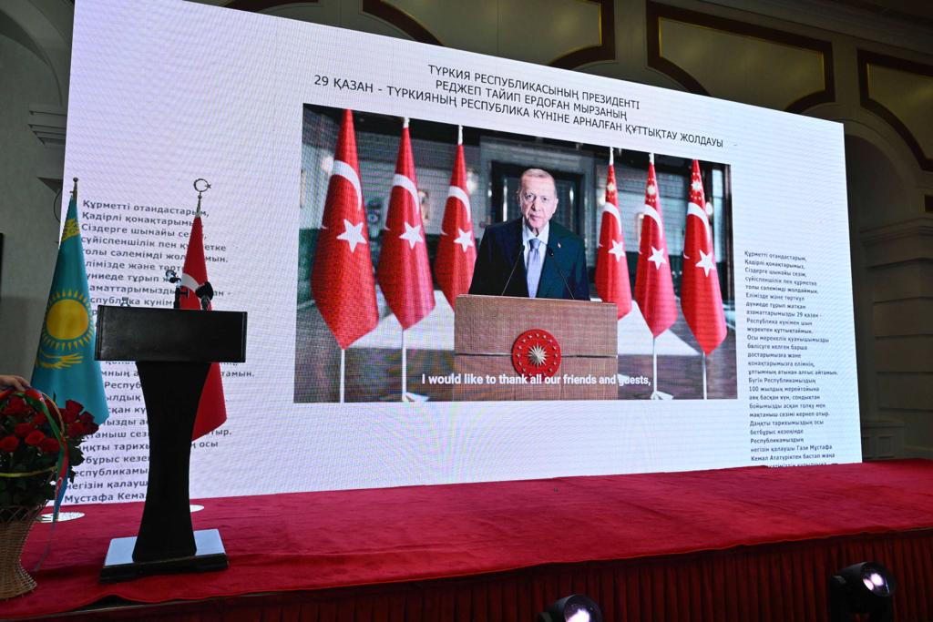 «باۋىرلاس تۇرىك حالقىن ەلىڭىزدىڭ تاريحىنداعى ايتۋلى وقيعا — تۇركيا رەسپۋبليكاسىنڭ 100 جىلدىعىمەن شىن جۇرەكتەن قۇتتىقتايمىن. تەرەڭگە جايىلعان اسىل تاريحىنان, باي مادەني مۇراسىنان, حالقىنىڭ قايسارلىعى مەن دانالىعىنان باستاۋ الاتىن بۇگىنگى انادولى قارقىندى دامۋعا قول جەتكىزىپ, جاھاندىق دەڭگەيدەگى كوشباسشى ءاpi قۋاتتى ەلدەردىڭ قاتارىنا ەنگەنىن ەرەكشە قۋانىشپەن اتاپ وتەمىن. ءسىزدىڭ ساليقالى دا كەرەگەن ساياساتىڭىز, قاجىرلى كۇش-جىگەرىڭىز بەن يگى باستامالارىڭىز ەلىڭىزدى جاڭا التىن عاسىرعا قادام باستاپ, بيىك ماقسات-مۇراتتارعا جەتەلەي بەرۋىنە شىنايى تىلەكتەسپىن», دەلىنگەن پرەزيدەنت قۇتتىقتاۋىندا.