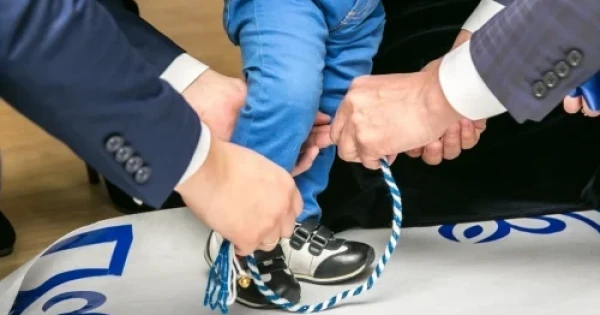 تۇساۋ كەسۋگە ارنايى دايىندالعان اق-قارا ارالاس ەسىلگەن ءجىپتى بالانىڭ الدىنان, وتكىر پىشاقپەن كەسۋ كەرەك.