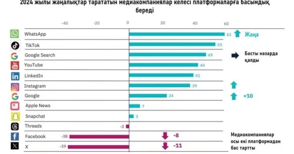 Əلەۋمەتتىك جەلىلەر مەن الگوريتم دəۋىرىندە ادامنىڭ نازارىنا, ۋاقىتىنا تالاس تۋىندايتىنى ءسوزسىز. 2024 جىلى مەديا ماماندارى ءۇشىن باستى جاڭالىقتاردىڭ ءبىرى «WhatsApp» پلاتفورماسىنداعى وزگەرىستەر بولۋى مۇمكىن. سەبەبى «Meta» كومپانياسى «WhatsApp» پەن «Instagram» جەلىلەرىندە حابار تاراتۋدىڭ قوسىمشا ارنالارىن دامىتۋدى جوسپارلاپ وتىر. بۇل اقپارات تاراتاتىن ساندىق پلاتفورمالار اراسىنداعى باسەكەلەستىكتى ودان ءارى كۇشەيتەتىنى انىق. ساۋالناما نəتيجەلەرى كورسەتكەندەي, «TikTok» جانە «YouTube» سياقتى بەينە جەلىلەرگە دەگەن قىزىعۋشىلىق جوعارى بولىپ قالا بەرمەك.