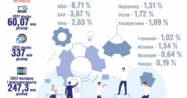 سونداي-اق تسيفرلىق دامۋ, يننوۆاتسيالار جانە اەروعارىش ونەركاسىبى مي­نيسترلىگى مەملەكەت باسشىسىنىڭ IT قىز­مەتتەرىنىڭ ەكسپورتىن 1 ملرد دوللارعا دەيىن جەتكىزۋ تۋرالى تاپسىرماسى بار. وسى تاپ­سىرماعا سايكەس مينيسترلىك اقپا­راتتىق-كوممۋنيكاتسيالىق تەحنولوگيا­لار سالاسىنداعى ەكسپورتتىق الەۋەتتى ارتتىرۋ ماقساتىندا قولايلى جاعدايلار مەن قۇرالداردى جاساپ جاتىر. وسىعان بايلانىستى شەتەلگە وتاندىق تسيفرلىق شەشىمدەر ەكسپورتى كولەمى ۇلعايىپ, 2023 جىلدىڭ ءبىرىنشى جارتىجىلدىعىندا ءىت قىزمەتتەرىنىڭ ەكسپورتى 247,3 ملن اقش دوللارىن قۇرادى. 2022 جىلدىڭ ءبىرىنشى جارتىجىلدىعىمەن سالىستىرعاندا (110,5 ملن دوللار) ءىت قىزمەتتەردىڭ ەكسپورتى 2,2 ەسە ءوستى. IT قىزمەتتەرىنىڭ ەكسپورتى 2021 جىلدىڭ سوڭىندا 60,07 ميلليون اقش دوللارىن, ال 2022 جىلى 337 ميلليون اقش دوللارىن قۇرادى. الىنعان مالىمەتتەرگە سۇيەنە وتىرىپ, كومپانيا­لار نەگىزىنەن كەلەسى ەلدەرگە ەكسپورتتايتىنىن اتاپ وتكەن ءجون: امەريكا قۇراما شتاتتارى (8,71%), بىرىككەن اراب امىرلىكتەرى (3,67%), كيپر (2,65%), نيدەرلاند (1,51%), رەسەي فەدەراتسياسى (1,72%), ۇلىبريتانيا (1,09%), گەرمانيا (1,02%), يسپانيا (1,54%), يرلانديا (0,64%), كانادا (0,19%).
