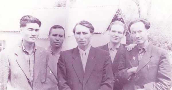 1961 جىلى 10 مامىردا قاسكەلەڭ قالاسىندا تۇسىرىلگەن مىنا سۋرەتتە «كوممۋنيزم ءۇشىن» گازەتىندە قىزمەت ىستەيتىن جىگىتتەر بەينەلەنگەن – حاسان قازمۇحانوۆ (سولدان وڭعا قاراي), نۇرسۇلتان الىمقۇلوۆ, نۇرسۇلتان جۇنىسباەۆ, گريگوري مۋللين جانە مۇحامەتجان ەتەكباەۆ.