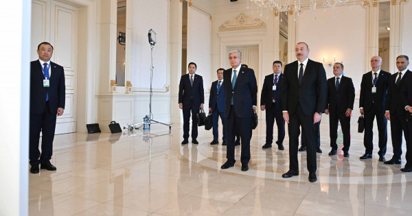 قاسىم-جومارت توقاەۆ پەن يلحام اليەۆ سيان قالاسىنداعى قازاقستان مەن قىتايدىڭ جاڭا كولىك-لوگيستيكا ورتالىعىنان شىعىپ, ترانسكاسپي حالىقارالىق كولىك باعىتىمەن (تحكب) اپشەرون ستانتسياسىنا كونتەينەرلى بلوك-پويىزدىڭ كەلۋىنە وراي ۇيىمداستىرىلعان سالتاناتتى ءىس-شاراعا تەلەكوپىر ارقىلى قاتىستى.