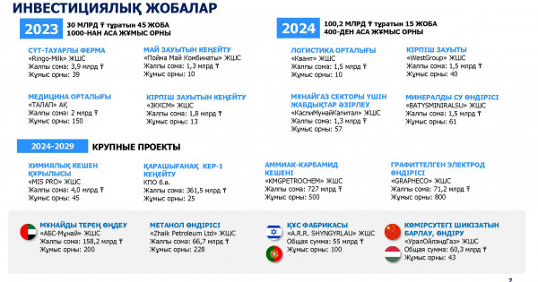 باتىس قازاقستان وبلىسى كاسىپكەرلىك باسقارماسىنىڭ مالىمەتىنە سايكەس, وڭىردە بىلتىر ينۆەستورلاردىڭ كۇشىمەن 45 جوبا ىسكە قوسىلعان ەكەن. وسىنىڭ اياسىندا 1 مىڭ جاڭا جۇمىس ورنى اشىلعان. جالپى العاندا 2023 جىلدىڭ قورىتىندىسى بويىنشا نەگىزگى كاپيتالعا سالىنعان ينۆەستيتسيا كولەمى 16,4%-عا ءوسىپ, 645,6 ملرد تەڭگەنى قۇراعانىمەن, ونىڭ باسىم بولىگى قاراشىعاناق كەن ورنى ارقىلى تارتىلعان ينۆەستيتسيا بولاتىن.