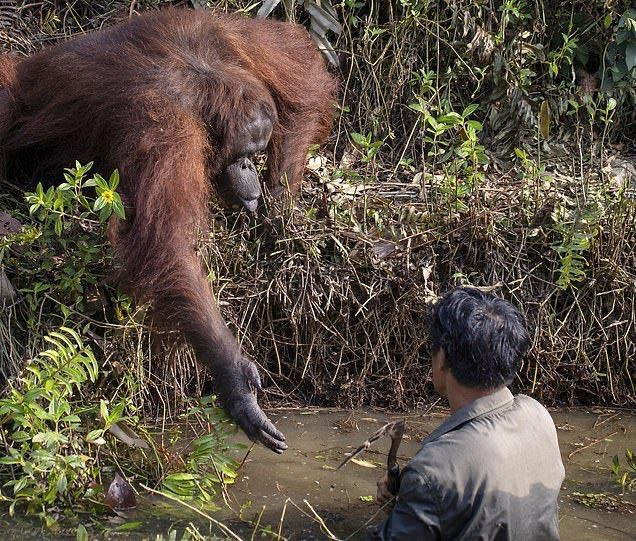 سۋرەتتەگى ادام – كاليمانتان ورانگۋتانىن قورعاۋ قورىنىڭ قىزمەتكەرى. ول وزەننەن پريماتتاردىڭ جاۋى سانالاتىن ۋلى جىلانداردى ىزدەۋ كەزىندە مي باتپاققا باتا باستايدى. ءدال وسى كەزدە قور قىزمەتكەرىنە ورانگۋتان جاقىنداپ, كومەك قولىن سوزادى. الايدا جۇمىسشى ماق ۇلىقتىڭ قولىنان ۇستاماي, وزەننەن وزدىگىنەن شىعىپ كەتكەن. جابايى جانۋارعا سەنىم جوق, سوندىقتان ونىڭ قالاي ارەكەت ەتەتىنى بەلگىسىز.
