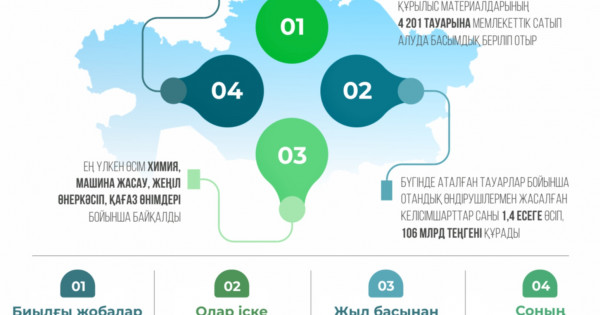 وتاندىق تاۋار وندىرۋشىلەردى قولداۋ شارالارى تۋرالى ونەركاسىپ جانە قۇرىلىس ءمينيسترى قانات شارلاپاەۆ باياندادى. ونىڭ ايتۋىنشا, وتاندىق تاۋار وندىرۋشىلەرگە قولداۋ كورسەتۋ اياسىندا جەڭىل ونەركاسىپ, ماشينا جاساۋ, حيميا, مەتاللۋرگيا سالالارىنداعى جانە قاعاز, جيھاز, قۇرىلىس ماتەريالدارىنىڭ 4 201 تاۋارىنا مەملەكەتتىك ساتىپ الۋدا باسىمدىق بەرىلىپ وتىر. بۇگىندە اتالعان تاۋارلار بويىنشا وتاندىق وندىرۋشىلەرىمەن جاسالعان كەلىسىمشارتتار سانى 1,4 ەسەگە ءوسىپ, 106 ملرد تەڭگەنى قۇرادى. ەڭ ۇلكەن ءوسىم حيميا, ماشينا جاساۋ, جەڭىل ونەركاسىپ, قاعاز ونىمدەرى بويىنشا بايقالدى.