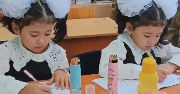 بەينەجازبادان مەكتەپ فورماسىن كيگەن بىرنەشە جۇپ ەگىزدىڭ العاشقى ساباق كۇنىنە بارا جاتقانىن كورۋگە بولادى. ءار ەگىز ءوز باۋىرىنىڭ قاسىندا وتىرعانىن دا بايقاي الامىز.