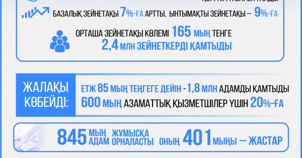 ەلىمىزدە جىل سايىن زەينەتاقىنى كوتەرۋگە ارەكەت جاسالادى. بيىل دا ول ۇردىستەن تانعان جوق. Primeminister.kz سايتىنىڭ مالىمەتىنشە, بازالىق زەينەتاقى 7%-عا, ىنتىماقتى زەينەتاقى 9%-عا يندەكستەلدى. ناتيجەسىندە, 2,4 ملن زەينەتكەردىڭ, ونىڭ ىشىندە بجزق جيناقتاۋ قورىنان زەينەتاقى الاتىن 459,3 مىڭ زەينەتكەردىڭ زەينەتاقىسى كوبەيدى. ورتاشا زەينەتاقى كولەمى 165 مىڭ تەڭگەدەن استى. بۇعان قوسا, بازالىق زەينەتاقىنى كەزەڭ-كەزەڭىمەن كوبەيتۋ جۇمىستارى ءالى دە جالعاسىپ جاتىر. ال 2028 جىلعا قاراي جۇمىس بەرۋشى تولەيتىن مىندەتتى زەينەتاقى جارناسى 5%-عا ۇلعايماق. بيىلعى 1 قاڭتاردان باستاپ ەڭ تومەنگى جالاقى 85 مىڭ تەڭگەگە ارتتى. بۇل تىزبەكتە 1,8 ملن ادام, ونىڭ ىشىندە بيۋدجەت قىزمەتكەرلەرى بار. 600 مىڭ ازاماتتىق قىزمەتشىلەردىڭ جەكەلەگەن ساناتتارىنىڭ جالاقىسىن كەزەڭ-كەزەڭىمەن 20%-عا ارتتىرۋ جالعاسىپ جاتىر.