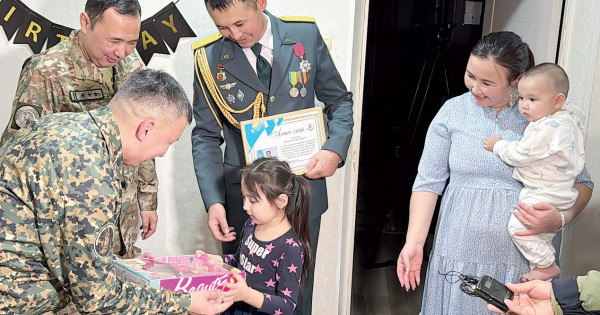 جاۋجۇرەك جاۋىنگەردىڭ وتباسىندا ءتورت بالا بار. قوناققا كەلگەن گەنەرال بالالارعا بازارلىق تاراتىپ, شاڭىراققا شادىمان قۋانىش سىيلادى. ايتپاقشى, حالىق قاھارمانى قايرات ۇمبەتوۆتىڭ ءوزى دە وقۋ-جاتتىعۋ كەزىندە قاتارداعى ساربازدى گراناتا جارىلىسىنان قۇتقارىپ, ەرەن ەرلىك ۇلگىسىن كورسەتكەن ەدى. بەيبىت كۇننىڭ قوس باتىرى قوعامداعى وقيعالارعا بەيجاي قاراماي, جاس ۇرپاقتىڭ بويىنا وتانسۇيگىشتىك قاسيەتتى دارىتۋ قاجەتتىگىن ءسوز ەتتى. كەش سوڭىندا كوپكە ۇلگى بولعان كوپبالالى وتباسى شاڭىراققا ارنايى ات باسىن بۇرعان ۇلتتىق ۇلان باس قولباسشىسىنىڭ ورىنباسارىنا العىس ءبىلدىردى.
