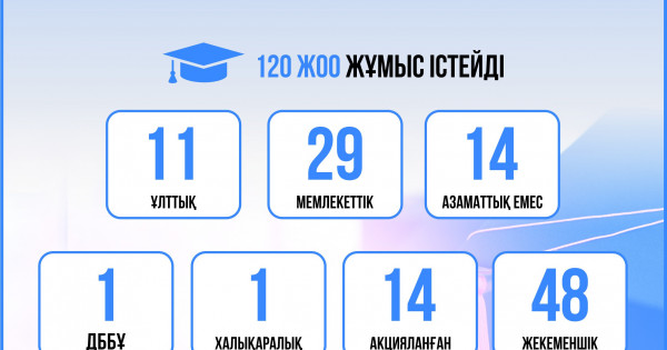 قازىر ەلىمىزدە 120 جوعارى وقۋ ورنى جۇمىس ىستەيدى. ونىڭ 11-ءى –ۇلتتىق جوو, مەملەكەتتىك جوو – 29, ازاماتتىق ەمەس جوو – 14, دببۇ (دەربەس ءبىلىم بەرۋ ۇيىمى) – 1, حالىقارالىق – 1, اكتسيونەرلەنگەن – 16 جانە جەكەمەنشىك – 48. ولاردا 642,5 مىڭنان استام ادام وقيدى. مەملەكەتتىك تاپسىرىسپەن 255,6 مىڭنان استام ستۋدەنت ءبىلىم الىپ جاتىر.