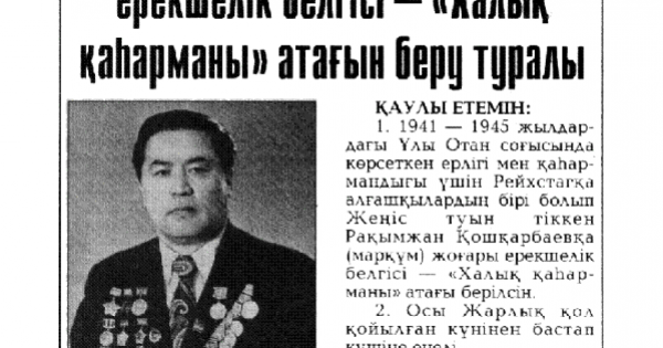 سونىمەن جانبولات اۋپباەۆتىڭ ۇسىنىسى مەن حالىقتىڭ قالاۋىنىڭ ناتيجەسىندە پرەزيدەنت نۇرسۇلتان نازارباەۆتىڭ جارلىعىمەن 1999 جىلى 7 مامىردا راقىمجان قوشقارباەۆقا حالىق قاھارمانى اتاعى بەرىلدى.